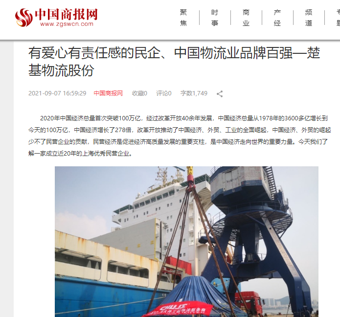 今年9月2日和7日中央新聞網(wǎng)站、中國主流財(cái)經(jīng)媒體中國商報(bào)對楚基物流進(jìn)行了兩次報(bào)道,楚基物流股份為上海市營商環(huán)境建言和支持公益慈善得到中國商報(bào)的肯定。