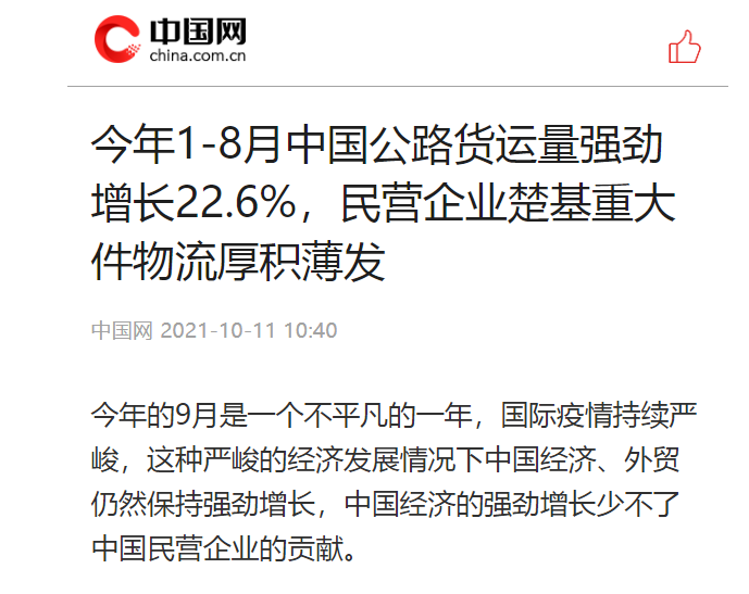 2021年12月8日中央官媒央廣網(wǎng)報(bào)道:今年前11個(gè)月,我國貨物貿(mào)易進(jìn)出口總值35.39萬億元人民幣,同比增長22%。今年我國用了11個(gè)月時(shí)間就超過了去年全年的進(jìn)出口總額,可見今年中國的外貿(mào)市場有多火爆。中國外貿(mào)的強(qiáng)勁增長少不了中國民營企業(yè)的默默付出,今年上海有家民營物流企業(yè)備受各大央媒的關(guān)注。