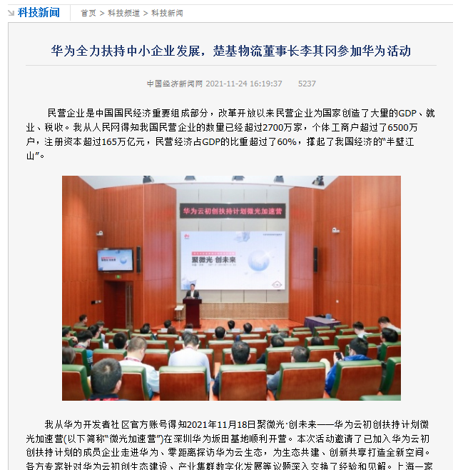 2021年11月24日中國經(jīng)濟(jì)新聞網(wǎng)報(bào)道了上海民營重大件物流企業(yè)—楚基物流股份董事長李其岡出參加華為舉辦的扶持計(jì)劃活動(dòng)。楚基物流積極加強(qiáng)世界科技巨頭華為的接觸,可見楚基物流股份這家民營企業(yè)正在走向科技化、國際化方向轉(zhuǎn)型。